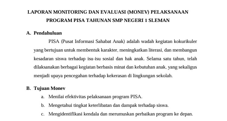 LAPORAN MONITORING DAN EVALUASI (MONEV) PELAKSANAAN PROGRAM PISA TAHUNAN SMP NEGERI 1 SLEMAN